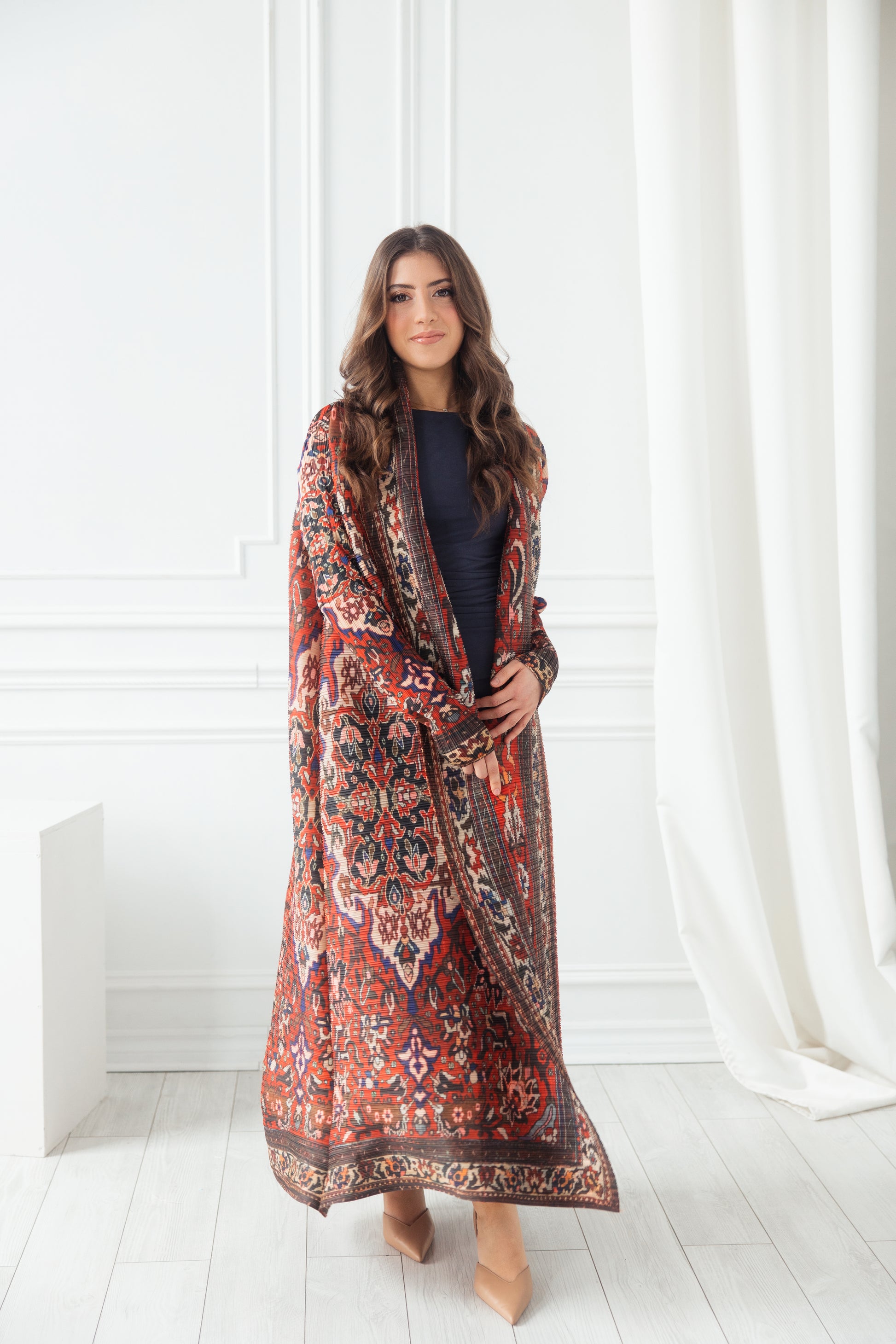 (عنبر) is a precious fragrance derived from ambergris. This abaya embodies warmth and timeless beauty. The fluid and structured silhouette captures the richness of deep amber tones.