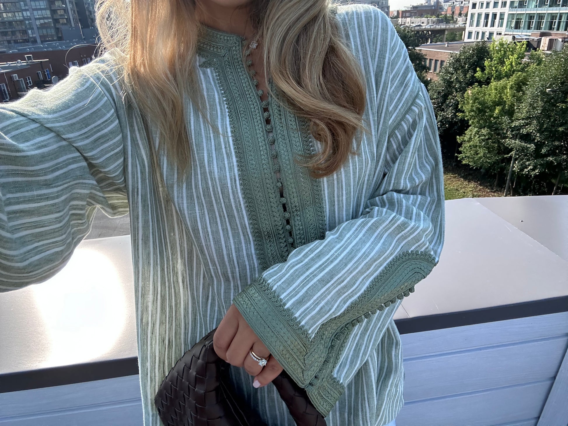 Inspired by the timeless Moroccan qamiss, this piece reimagines tradition with a modern twist.